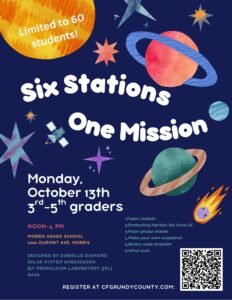 We are looking for students (8th grade thru High School) to help run the NASA Six Station, One Mission event at the Morris Elementary School on October 13th from 11am until 4pm. This is a fun way to earn school service hours.